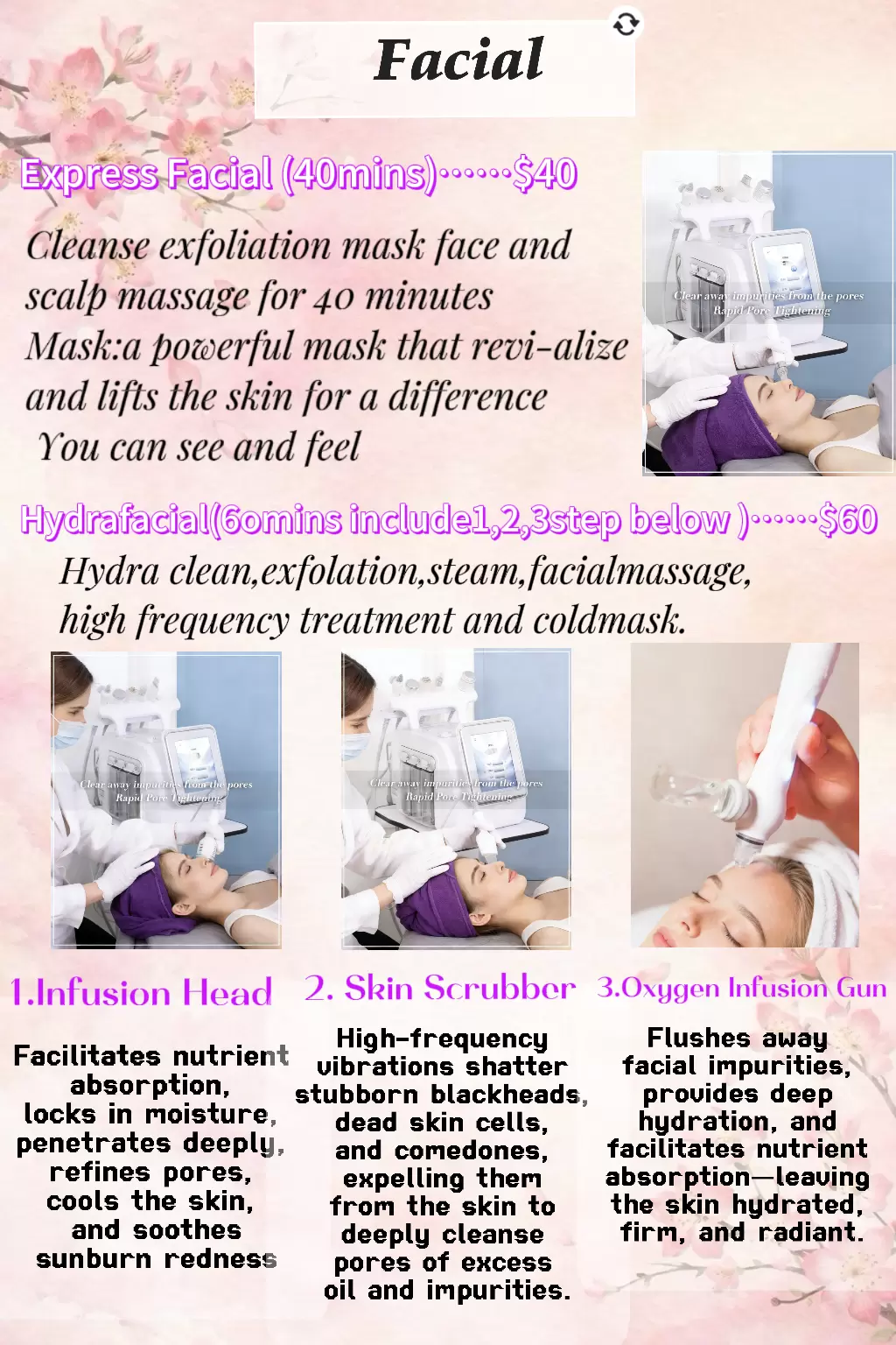 In addition to our massage services, we proudly offer a range of premium facial treatmentsdesigned to refresh and revitalize your skin. Choose from our Classic Relaxing Facial,Signature Hydrating Facial, or Anti-Aging Facial to restore your natural glow and enhanceyour well-being.