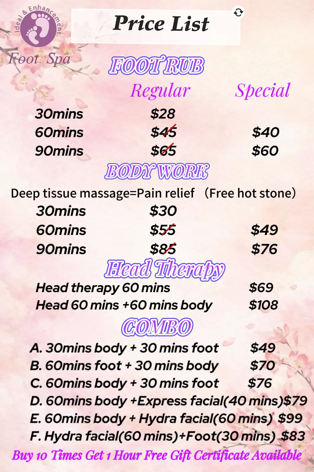 Went to Ideal&Enhancement Foot Spa for a deep tissue massage and will definitely be returning.. I was able to make an appointment the same day, the massage was amazing and the price was very reasonable..